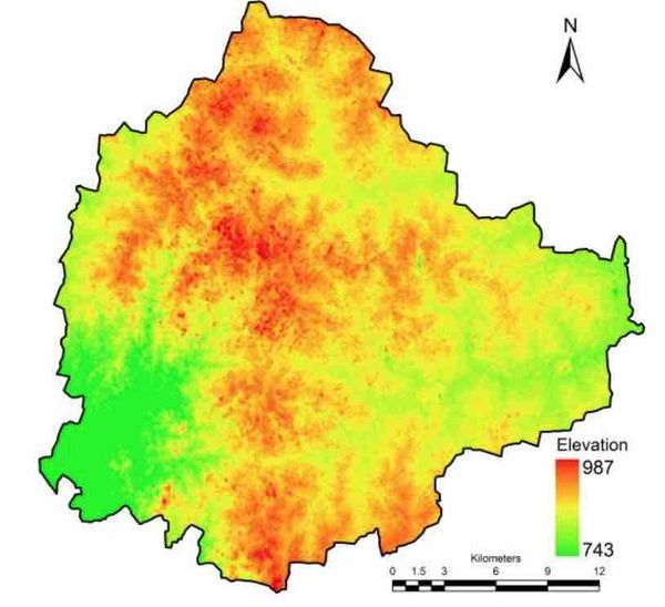 This map of Bangalore shows the different levels of elevation in the landscape of Bangalore.