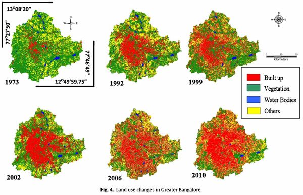 [[File:Land use changes in greater bangalore.jpg |thumb| center| 600x1500px| This map of Bangalore shows the changes in the population and the land use by the growing inhabitants of Bangalore over time. ]]